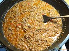 Na olivovom oleji orestujeme na hrubo pokrájanú cibuľu, cesnak, paradajky, chilli papričky,potom pridáme paradajkový pretlak a prilejeme trochu vína. Chvíľu podusíme a dochutíme soľou, korením, bazalkou a chilli korením. Necháme stáť. V druhom hrnci na rozpálenom oleji orestujeme mleté mäso, na ktoré potom vylejeme zmes.