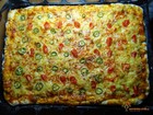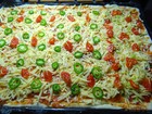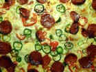 paradajkovým pretlakom (alebo paradajkové pyré na pizzu) roztlačeným cesnakom, oreganom a bazalkou potrieme pizza cesto. Potom poukladáme šunkovou salámou, postrúhaným syrom (cheddar alebo mozzarella), navrch nakrájame na polovičky cherry paradajky a prekladame Jalapeňos papričkami.