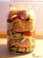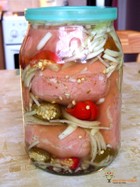 lúpeme špekačky, narežeme a vysypeme chilli korením, alebo omáčkou a vložíme plátok olúpanej cibule. Takto pripravenú špekačku vkladáme po vrstvách spoločne s korením, cibuľou a chilli papričkami. Po naplnení až po hrdlo zalejeme vriacim nálevom a zaviečkujeme. Necháme vychladnúť a vložíme do chladničky, kde necháme týždeň ustáť.